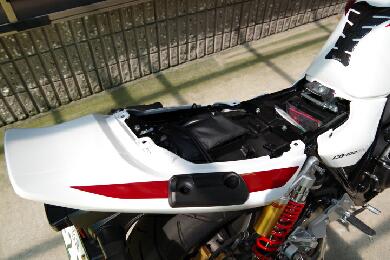 | テールカウルを取り外した状態です。ようやく純正のフェンダーのネジなどにアクセスできるようになりますので外していきます。 |