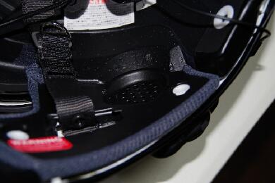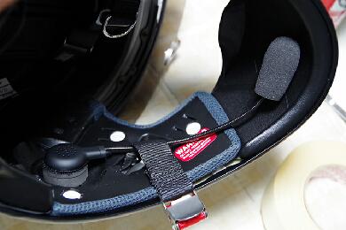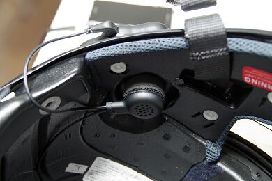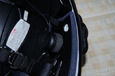 ヘルメットの耳が来る部分にスピーカーを取り付けます。片側はマイクが一緒になってますので向きを考えて設置しないとマイクのフレキシブルアームが微妙な方向になってしまうと思います。 |