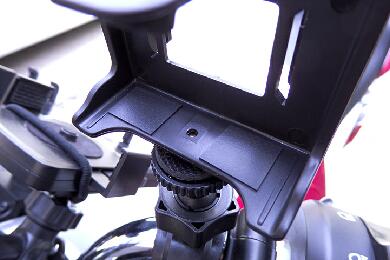 その後、別売りのハンドルマウント用のステーを購入しました。さすがにハンドルマウントだけあって強度的には全く問題もなくブレの問題も解消♪ ただボルドールだけにカウルがあるので画面にカウルが入り込んでしまうという状況に・・・ |