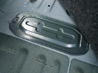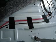 配線をバッテリー設置位置まで引き回します。配線に余裕を持たせればフロアにある突起をかわしてくぼみ部分だけでサイドまで配線をはわせることが出来ます。フロアマットの下になるので日頃目に付かない場所に配線をはわせるわけですので、熱などで配線の破損も考慮し可能ならばプラス&マイナスの配線は離して固定します。 |