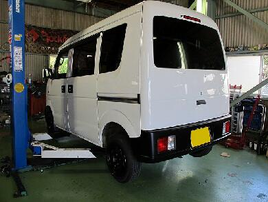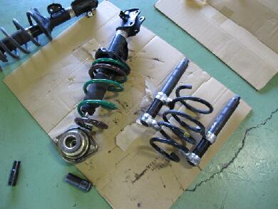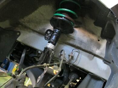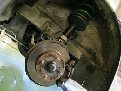 バネを抜いたらフレームについているバンプラバーをカットします。どんくらい切るか・・・だいたい35〜40mmほど落ちるわけですので、まぁそれに似たようなレベルで・・・今回は30mm(見た目で測ってません)ほどカットしました。バラした逆でバネを取り付けジャッキでホーシングを上げて元の位置に戻しサスの固定ボルトを締めてリアは完了です。この手の車のリアバネの交換は15分もあれば出来ます。 |