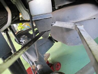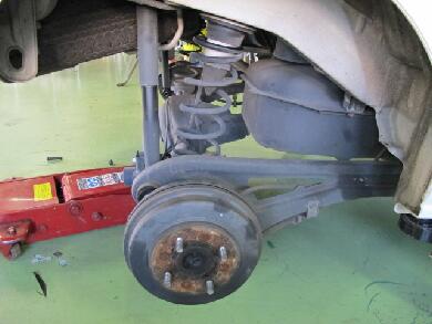 | 今回はリアから作業をしました。ホイールを外して伸びきってしまっているホーシングをジャッキで少し持ち上げてあげてサスを固定しているボルトを左右抜き取りホーシングをフリーの状態にします。ジャッキで上げているのはボルトに掛かるテンションを無くすためです。下がったままでも外せます。この段階でリアのバネは手で抜けます。 |