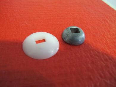 台座の裏側に入っている半球面スペーサーです。白い大きなほうがエブリィ純正、鉄で出来ている小さいほうがミラバン用です。これはエブリィの台座を使用するわけですのでその形にあったエブリィ純正を使用します。