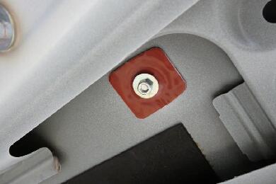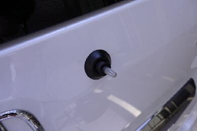 最初に準備した丸いリアゲートのワイパーレス用パネルを表側から貼り付けてしっかり固定します。いまさらですが、この状態でグルーガンでリアゲート内側から固定しても良かったかもです。