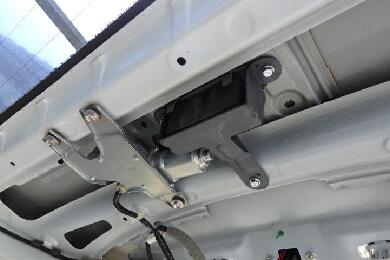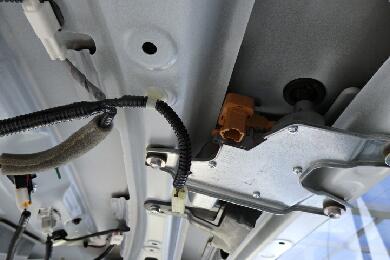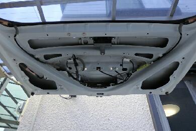 手前の黒い四角いものはたぶん錘ではないかと・・・リアゲートがスムーズに閉まるようにバランス用として装着されているような・・・。その隣がワイパー用のモーターです。
