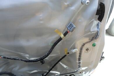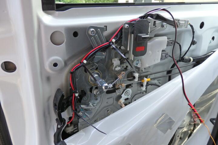 パワーウィンドウの配線と、ドアカーテシのケーブルを抵当に固定して実際に動作をするか確認します。問題なければドア内張りを戻します。