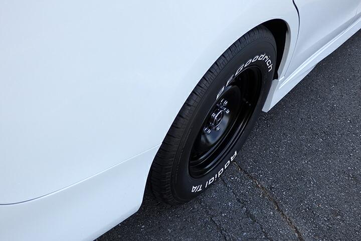 最初は前後同サイズのスチールホイールを装着しているのでリアがフェンダーに相当入ってました。