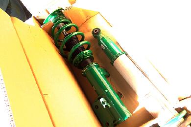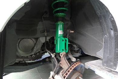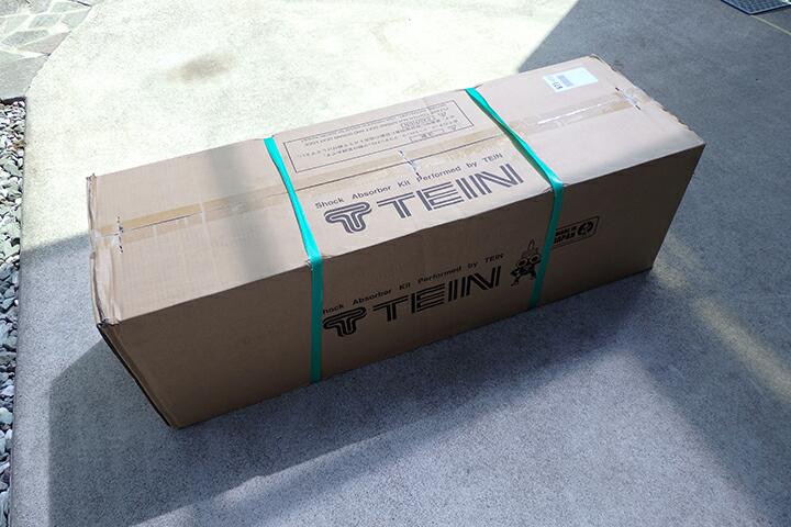 今回装着する車高調はTEINのフレックスZというモデルです。TEINでいうところの真ん中グレードの車高調ではないかと思います。安価な車高調はマウントが純正流用の場合が多いですが、こちらはマウント付ですのでフロントは純正サスを抜いて入れ替えるだけです。