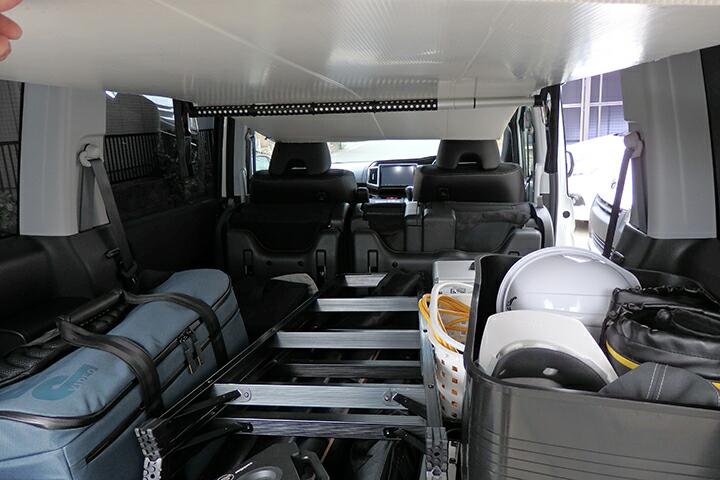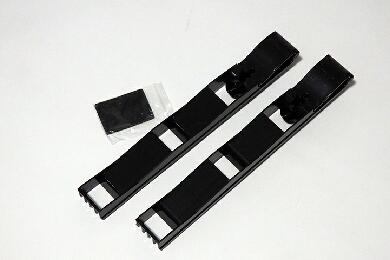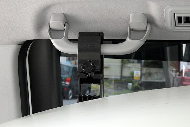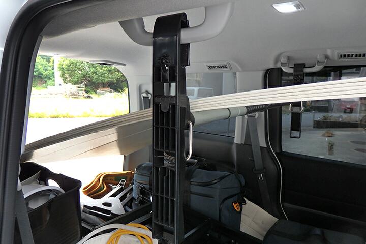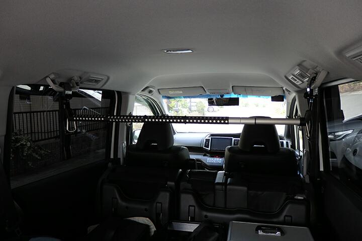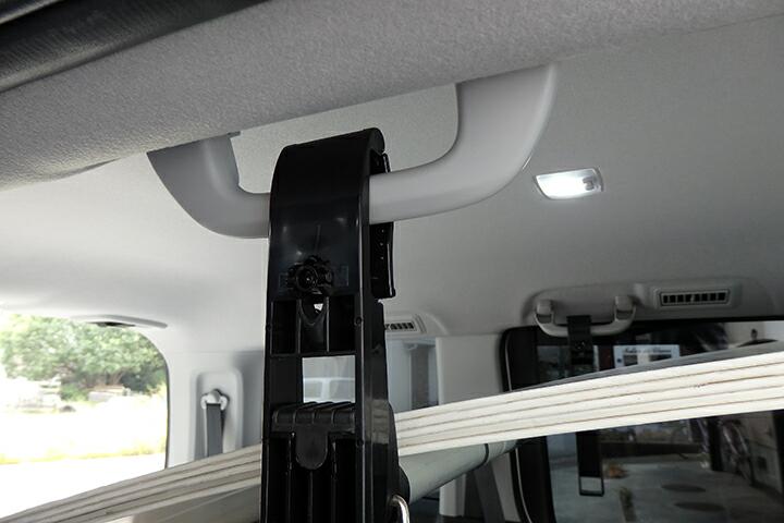 | とりあえず購入したのがセカンドシートにあるグラブレールを利用してバーを橋渡しするアイテムです。左右のグラブレールで直接橋渡ししてもいいのですが、グラブレールが比較的天井よりに装着されているのでルーフ内張りとのクリアランスが稼げずリアゲート側からプラ段を差し込むにしてもの内張りと干渉が避けられない感じです。 |