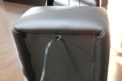 | 通した穴は裏側から黒いホットボンドを使って埋めておきます。穴を埋める目的もありますが、必要以上に配線を引っ張られないようにここで固定している感じです。 |
