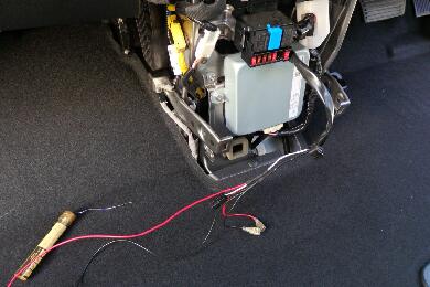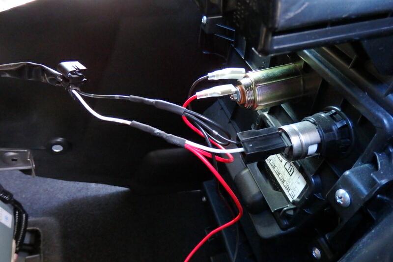 | 車体側のインパネ部分を元に戻して今回新設した配線を隙間から出しておきます。それぞれをすでにギボシにて繋ぎやすい様にしてあります。 |