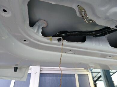 リアゲートのパネルを外し、針金を使ってリアゲート上部のブーツまで引き込みます。 |