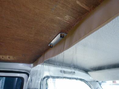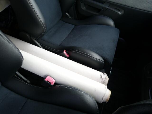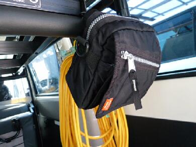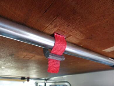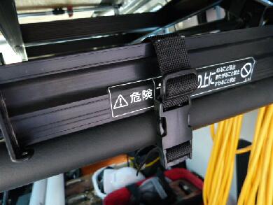 走行中に前後に動くと非常に危険ですのでこんな感じのワンタッチベルトを使ってます。コンパネ面に長穴をあけてそこにベルトを通してスタッカーで固定。このコンパネを乗せたときには画像のようにインナーバーに固定します。 |