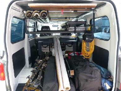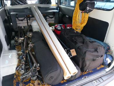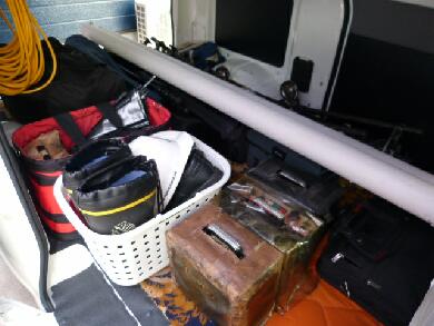 | 仕事で使う機材としては、やっかいなアイテムが2つあります。そのうちの1つが3×6サイズのプラ段です。平たい上に柔らかいのでフロアにおいてその上に機材を乗せるとダメになります。ですのでインナーバーの上にコンパネを載せてその上にプラ段を差し込むカタチにしてます。上部にあるパイプ3本は1.8mの背景紙を3本入れてあります。 |