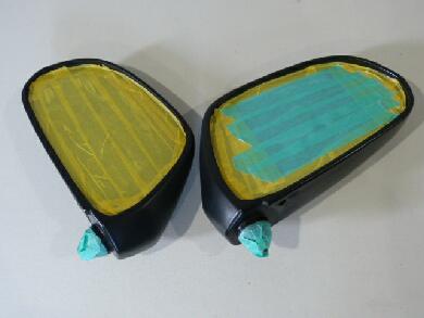 ということで早速・・・御馴染みの缶スプレー、ソフト99のつや消し黒で塗ります。鏡部分をしっかりマスキング。あとは可動部分となるところも塗らずにマスキングします。動きが悪くなるとイヤなんであえてマスキングで^^