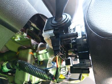 純正間欠ワイパーの下側から見た画像です。コネクターが1個刺さっているだけですのでそれを外し、ワイパーレバー本体を外します。