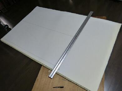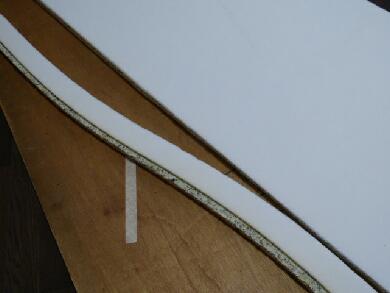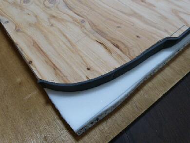 | 天板部分を若干小さくカットしたこともあるので隙間をうめるためにクッショテープを用意しました。まともに買うと高いので50cm幅のものを半分にして25mmの状態でそれぞれの板の左右に回り込ませます。 |