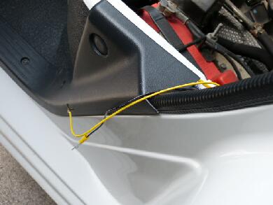 ウーファー配線にありがちなこの配線。アンプリモートのブルー、バッテリーの黄色、アースの黒ですがシートを上げている状態のときに見える部分となるのでゲルチューに入れ込んで見た目を良くしておきました。