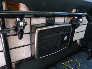 スペースをスポイルせずにウーファー本体の位置を散々考えたあげく、思いついたのがセカンドシートの座面裏・爆 この位置ならば仕事車として機材を積んでも全く問題のない位置です。とりあえずシート裏の骨組みを利用してウーファー付属のステーを挟み込んであるだけですが・笑