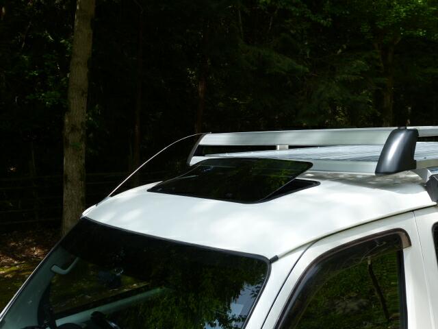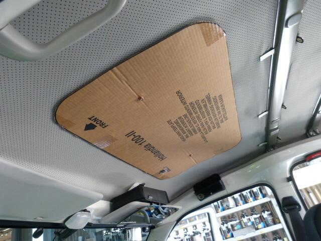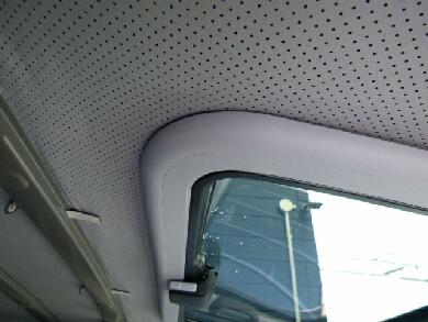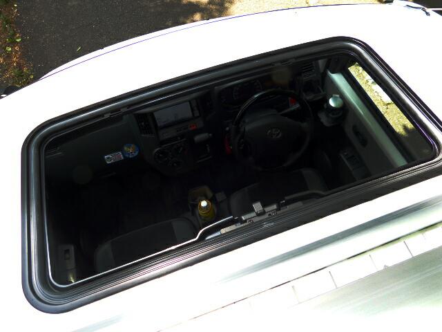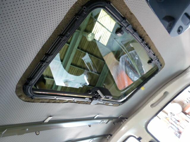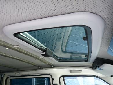 画像では判りにくいですが、ルーフの内張りとサンルーフの内張り枠の隙間が出来てます。タウンエースの場合、ルーフの鉄板に直接スポンジの内張りがついている関係で普通の乗用車のように厚い内張りが無いためです。ですので通常の内張りのある車ならばかなり綺麗に収まると思います。逆に曲面や厚さのある内張りであっても馴染むようにゴム製で出来ているのでバッチリ収まるかと思います。 |