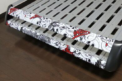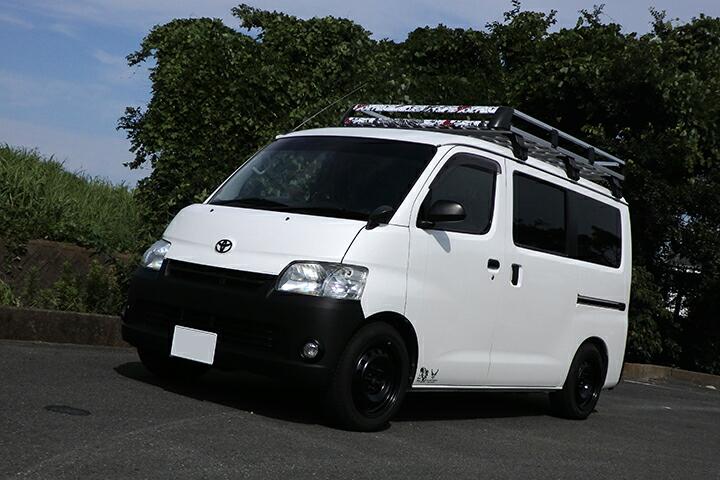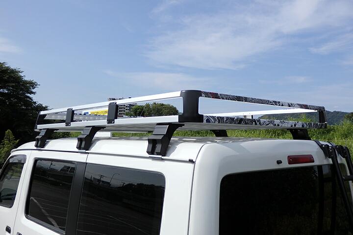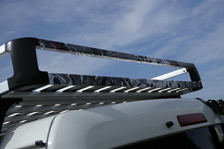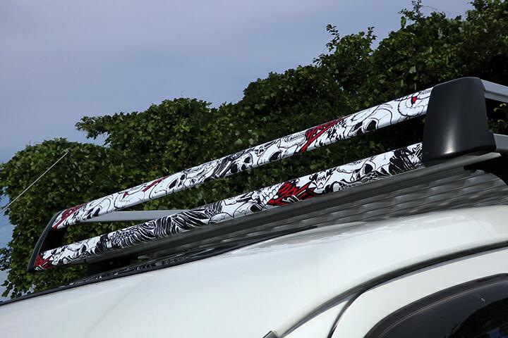 | このキャリア、降ろすのも大変ですが載せるのも結構大変です。そのまま載せるだけでは面白くないのでカッティングシートでデコレーションします。本当はキャリア全部を真っ黒に塗りたいくらいですが、板金屋に頼むにもタウンエースに載せて持ち込まないとですので、また降ろして・・・の作業が面倒です。 |