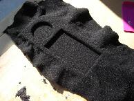 後ろ側を張る前の図ですが、見てもわかるとおりモケット生地の裏側にボンドを吹き付けて一度縦横斜め方向に引っ張りまくり生地をやわらかくなじませておくときれいに貼れます |