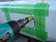 マーキングの内側でカットしていきます。まずはステップドリルやホールソーなどを使用して大き目の穴をあけてエアソーが入るスペースを作ります。気持ちの問題ですが周囲に養生テープを貼っておきます。 |
