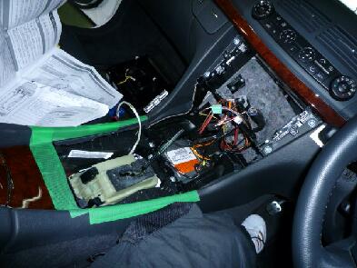 こんな感じでようやく画像中央のオーディオユニットが取り出せます。このユニットにロングハーネスのコネクター指す形になります。ロングハーネスは車内に引き込みフロアにひきなおしてセンターコンソールまで持って行きます。そのときにアンテナケーブル(付属)とバックカメラを装着するならばRCAの引き込みも忘れずに・・・ |