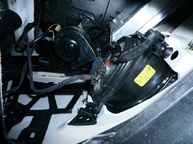 | 小窓から覗いたフォグランプ裏側です。スペース的には余裕がありますので作業は簡単です。フォグのバルブをハーネスごと取り外したあと、ハーネスからバルブを取り除きます。そのほうが手探りでカプラーのロックを探す必要がないので楽にバルブを外せますんで(^^) |