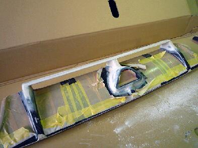 とりあえず3本あるフィンのうち、両サイドのフィンの延長をやっているのですが・・・まだなんも削ってませんがなんとなくカタチにはなってきました。発泡スチロールの目の細かいヤツのブロックをカッターでおおよその形にカットしてFRPのシートをのせて本来のフィン部分と一緒にペタペタと樹脂を塗りまくってます・笑 |