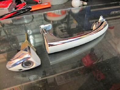 取り外したドアハンドルです。ロック側の小さな部品がトルクスでとまってます。それを外したらハンドル部分をロックの部分がなくなってスペースがある方向へ引きながらはずします。イメージ的には後方へずらす感じです。