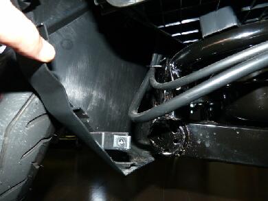 アンダーカバーを外します。ロンホイ化するということはブレーキワイヤーなども伸びるわけですのでどこかに伸ばす分だけの余裕がないといけません。 |