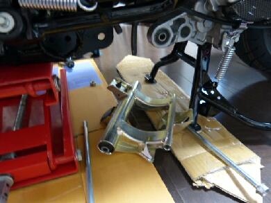 | まずエンジン側を繋いでいる長いボルトを抜きます。この作業をするときはセンタースタンドでエンジン側を支え、車体側にはジャッキをかけておきます。 |