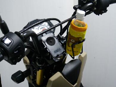 500の定番ペットボトルをガッツリ固定できます^^ ペットボトルが汗をかいて水滴がぽたぽた垂れるとステップに落ちて面倒なので「リラックマ」のペットボトルカバーを装着してます・笑 たぶんお茶かなにかのオマケでついてきたものですが^^;