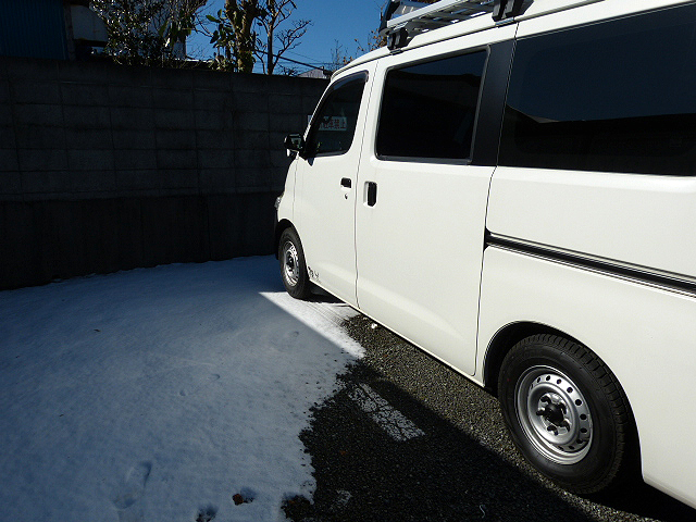 タウンエース402カスタム ブログ ついに場面?スタッドレス 2015年2月2日 7013WORKS コメントする 先週の土曜日に日延べになった現場に行ってきました♪ 日陰になっている凄く狭い範囲ですが雪が残ってました*^^* ついにタウンエースのスタッドレスが活躍する場面です・・・というか広い駐車場のわざわざ雪の残った駐車位置に停めて無理に踏んで来ました^^; しかも左前輪のみ>< たぶんスタッドレスタイヤも場面を迎える事が出来て相当喜んでいるかと思います・・・今シーズン初、積もった雪を見れて一番喜んでいたのはボクですが^^;
