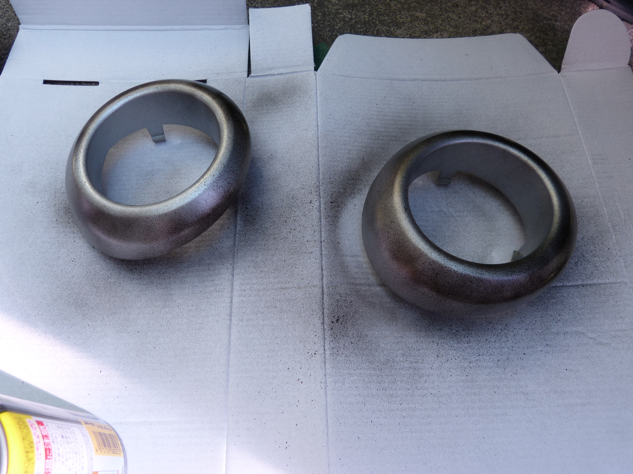 ミラココアのフォグベゼルはシルバーなので、ウチの黒バンパー仕様のタウンエースに装着すると少々浮きます^^; 毎度お馴染みですがつや消しブラックに塗装します♪ スコッチブライトでシコシコやってからプライマーを吹いてつや消し黒でスプレーしました。