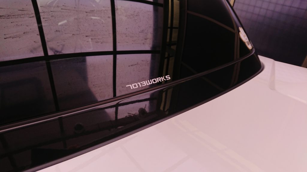 7013worksステッカーをリアウィンドウに貼っておきました。窓の汚れっぽく見えるのは映り込んだカーポートの天井の汚れです・笑 ちなみに24時間監視用のカメラが8台設置してあります。真っ暗でもクッキリ映ります。解像度が高くうちのカメラで2回ほどおまわりさんに協力して近所であったなにかの犯人逮捕に繋がったそうです。