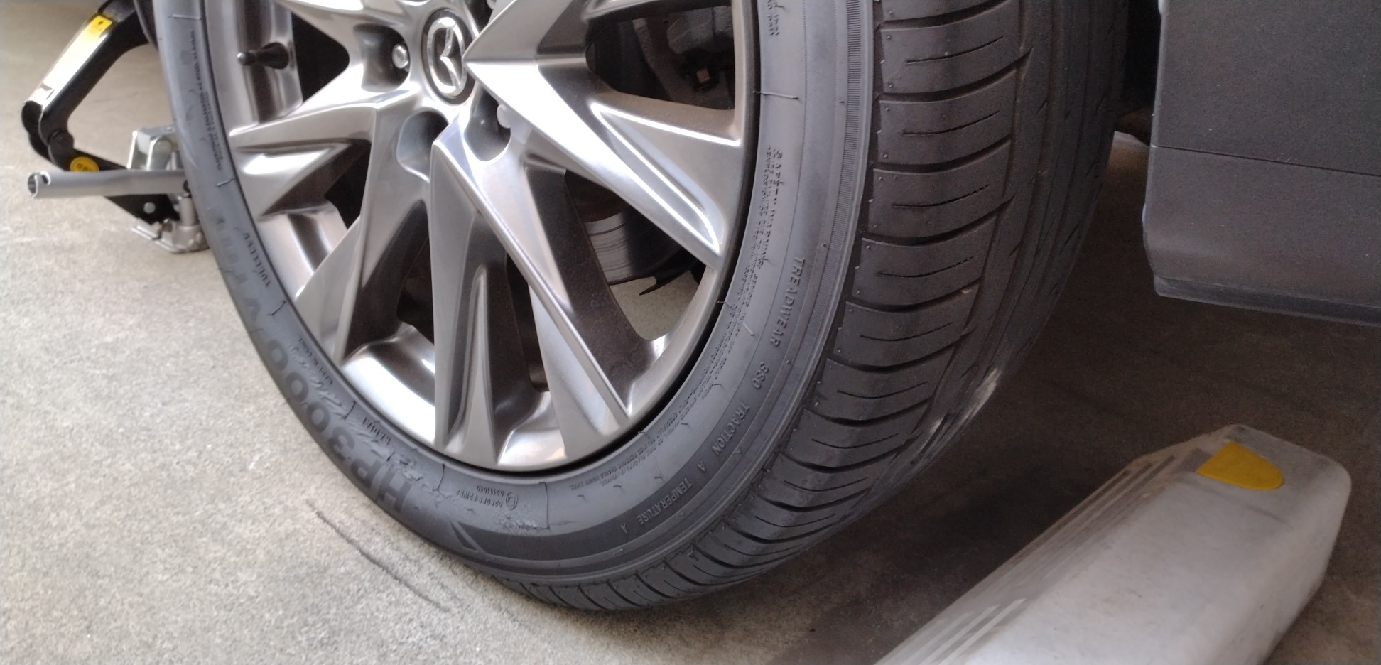 CX-8のタイヤ、まだ入れ替えてそれほど走ってないタイヤがパンクしました。しかも大き目の金属片を踏んでいたので1.5cmほどの切り口でパンクしてます。人生でパンクってなかなかないトラブルですが、最悪は1本新品にしなくてはならない状況で。。。とりあえず自分の現在の体調ではタイヤ・ホイールを自分で外すのは無理ですので今日の午前中にお友達が来て外してから工場に持って行ってみてくれるそうです。実際は空気が抜けてぺったんこなんでサイドウォール保護のためジャッキアップしてある状態です。ってボクが踏んだんじゃなくて嫁が踏んだんですが。。。でもあんな建材の破片のようなものが道路に落ちてるとは。。。外壁に使う建材のようなもので1辺が5cmくらいある3角形の破片でした。