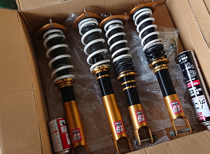 車高はそのままでってずっと言い続けてましたが、どーしてもあのフェンダーの隙間が気になります。そんなわけで足回りを変えることにしました。当然隙間を少なくする見た目を改善する目的ですが、今でさえ乗り心地を言ったら固めのRFを下げたうえで快適になれるか考えた結果、ボクが導き出した答えは「良い足回りを入れる」です。ここでいつものボクなら「足回り専門メーカーのTEINが良いに決まってる」ってなりますが、街乗りで(リハビリ行くだけ・笑)サーキットも走らないし、一般公道でも熱い走りは出来ないボクにベストな足回りを発見しました。HKSのハイパーマックス4GTです。この足回りはほどほど飛ばせますが、サーキットなどのは不向きということで、たぶん柔らかいんじゃないかと・笑 見た目で普通と違うのはヘルパースプリングが付いているんですね、車高超って良く下げても乗り心地が変わらないとかいいますが、そんなことはないとボクは思ってます。なのでこの足を使ってべらぼうに下げるんではなく、「2cm程度さげられれば良い」ってことで。もし乗り心地が悪化するならば再度ノーマル足に戻せるように捨てずにとっておきます。このハイパーマックス4GTは知人のRFでもかなり評価が良いので期待してます。推奨は4cmダウンだそうですが、ボクは2cm下げで、ちなみに装着は後日の予定です。乗り心地って人によって基準が違いますんで、どーなることやらですね・笑