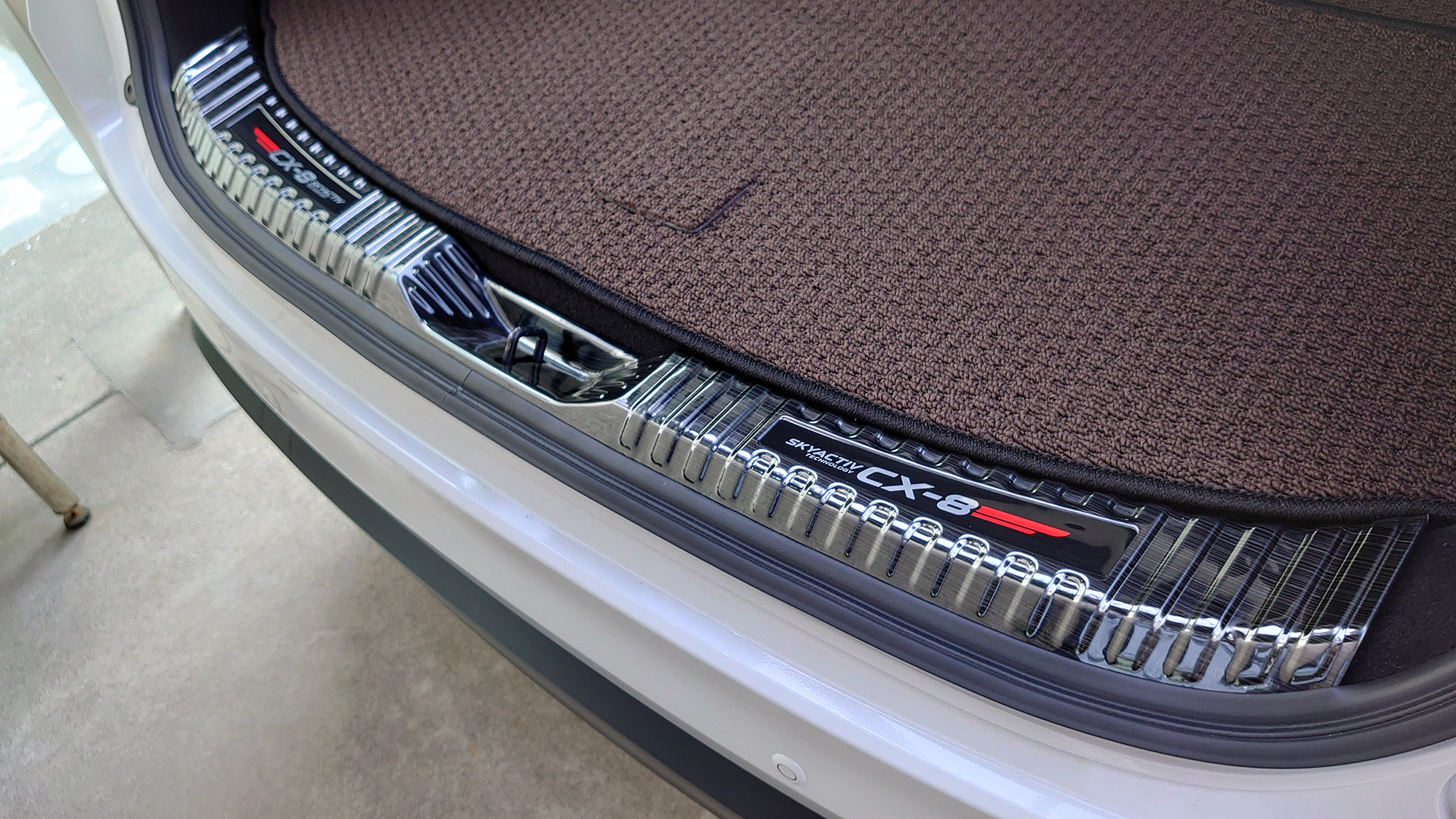 このパーツはウチにとって凄く大事。というのもCX-8は乗用車だけど仕事で機材を運ぶ車としても活躍してもらわないといけません。積み込むときはこういう部分を引きずることもあるんで、極力傷をつけないように分割式ではなく中央部分も覆うタイプの一本物のスカッフプレートを用意しました。実は別メーカーのものも用意してあったんですが、デザインがサイドのスカッフプレートに似ていたのでこっちにしました。造りはサムライプロデュース製のほうが良かったです。こっちはヘアライン風であっちはちゃんとしたヘアライン・ブラックだったんで。分割式だったんでフィッティングは間違いなくサムライプロデュース製のほうが良かったかと思います。