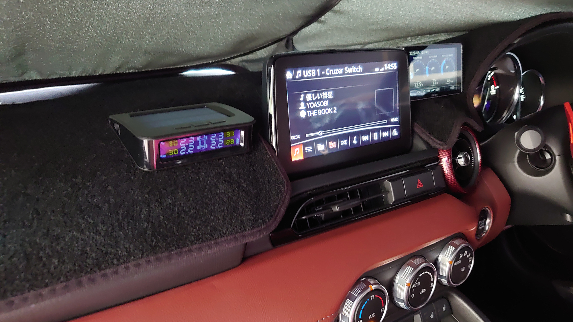 これまでRFのレーダーはフロントウィンドウ上部でしたが、購入したサンシェードがやりにくいことと、運転時の目線移動が大きく見にくかったので、このタイミングで位置を変更しました。うちのRFにはマットが敷いてあるのでマットに切り込みを入れてレーダーの足を通し、土台自体はダッシュボードに魔法の両面テープで固定しました。ダッシュボードに曲面が多いロードスターRFは付属の両面テープでは固定がうまく出来ず、魔法の両面テープを使いました。超ガッツリ固定できたと思います。んで空気圧センサーはモニターの左に設置して裏面をマジックテープを貼ってダッシュマットに固定しています。とりあえずコレでサンシェードが設置しやすくなりました。