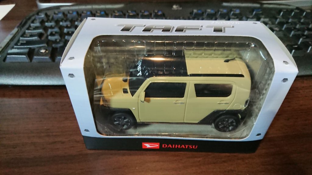 結局タフト、買うことにしました。ベージュでブラックメッキパック・ブラックパック・ディーラーナビ9インチ・前後ドラレコなどなど。希望ナンバー、白オリンピックナンバー、リアダイハツエンブレムのダークメッキ、ETCの本体とセットアップ、ドアバイザーやマット、スカッフプレート、ナンバーフレームなどが一式セットになったものも付けて結局定価で220万くらいw ただ、ありえないほどの値引きを提示され見に行って1時間もかからず即決w 売れてない普通乗用車並みに値引いてくれるから決めちゃいました。納車は10月頃とのことでしたので支払いは納車が決まってからなんでまだ先です。それまでにも数カ月貯められるんで現金一括で♪Ñボックス以来の新車です。決め手は安全対策装置と天井ガラスの解放感ですね。本来バイクが好きで乗りたいですが、半身麻痺の体調のことも考えてガラスルーフの車で我慢です。ちなみに契約時にタフトのミニカーもらいましたw