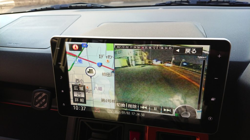 タフトの純正9インチナビを装着してますが、リアのドラレコがリアウィンドウにありません。リアのドラレコカメラはというと、実はナビのバックカメラと共用なんですね。実にスマートな感じです。気になる画質は・・・良いとは言えませんが無いよりは良いという画質です・笑 基本的に再生はその時のマップを表示しながら前後カメラ共にナビ本体でできます。画質はともあれスマートな仕組みで良いと思います。