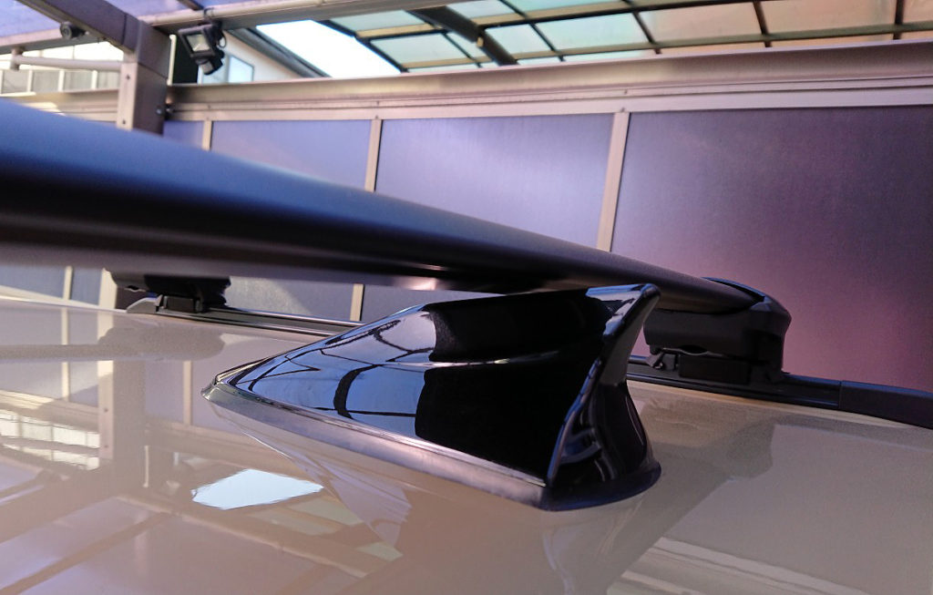 ルーフにあるバーとバーの間が狭すぎるとカッコ悪いのでドルフィンアンテナ装着時でもリア側のバーを可能な限り後ろに下げてみました。まさにドルフィンアンテナとのクリアランスは1mm。これ以上後ろに下げると当たります。この限界位置でも許せる範囲かと。ドルフィンアンテナを装着してなければあと5cmくらいは後ろに下げれそうです。ちなみにドルフィンのほうが純正同等のINNOバーよりも高さがあるのでこれ以上は無理です。