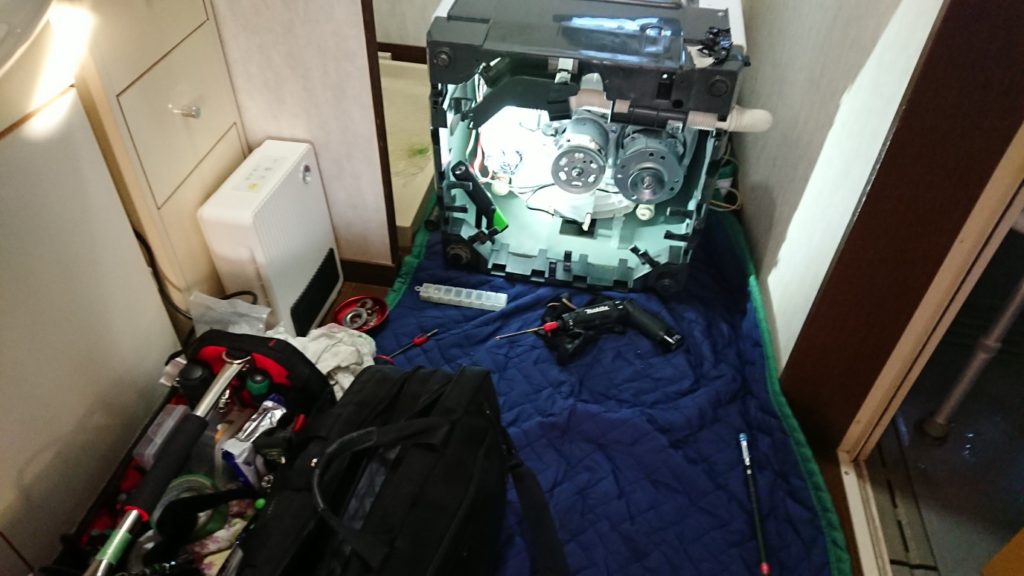 実は先日、「洗濯機」が突然壊れました。まぁ何年か使っていれば壊れるよ。っていいながら新しい洗濯機を買おうとネットを見てると嫁から「2018年製」ってなってるよ。と。ていうか3年で壊れるってどうよって思いながらネットの購入履歴をみたところ、楽天で長期保証付きで購入している洗濯機でした。しかも調べたら5年保証!早速購入時の明細を引っ張り出してみると確かに5年保証の保証書がw これはラッキーと早速サポートに電話。まさかの翌日に出張修理にきてくれるとのこと。んでマジで良く実に修理に来てくれました。いろいろ説明して症状を伝えると「たぶん重症ですよ」とのこと。んで実際に修理してもらうと、モーターからギアユニット一式…などなどでひっくり返して見える部品をすべて新品にかえてくれました。まさか壊れると思ってなかった洗濯機は部品だけで38000円だそうで…結局5年保証のおかげで0円で修理出来ました。部品を交換していただいた洗濯機は今まで以上に静かになりました。ちょっとラッキーだった話でした。画像は洗濯機の真下です。