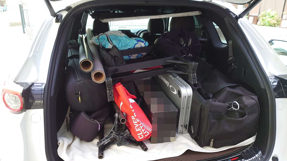 数日後に仕事の予定が入ったので実際に使用する機材を積んでみました。以前の仕事車BS9アウトバックよりも、頭上の天井スペースが広かったためジェットバッグに積んでいたプラダンと脚立が積めるようになりました。脚立についてはラゲッジスペースの長さが長くなったことでですが。一応積めることは確認できたので良かったです。この場合でも、床や天井も含め養生できる場所はすべて養生してます。養生テープや毛布を使ってます。まだスペース的には余裕がありそうです。