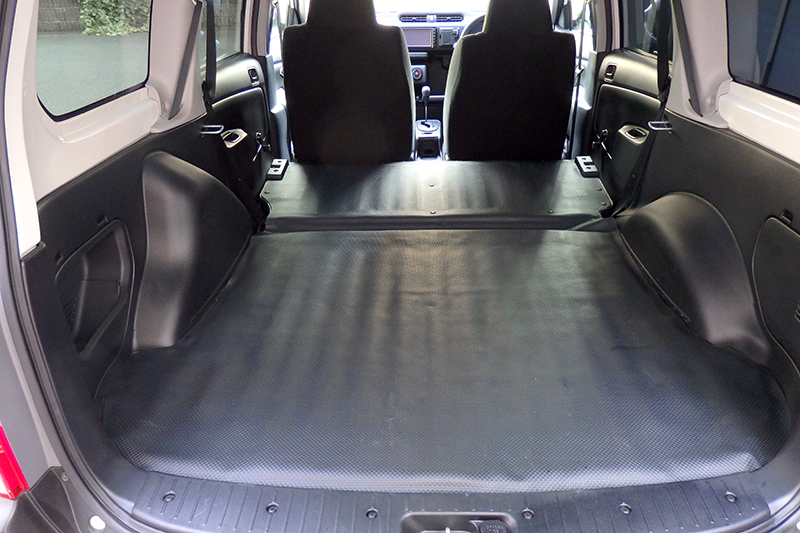 やはり商用バンならではのビニールカーペット的なものですが、これすら汚すのはイヤなので、我が家で代々引き継がれている様子のおかしい柄のカーペットで養生する予定です^^