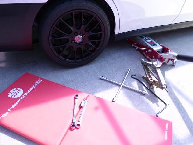 自宅ガレージでの作業ですのでフロントにはタイヤ止めを突っ込んであります^^ 今回はアブソーバーの上部のループマウント部分をイジる関係でジャッキは2台用意します。