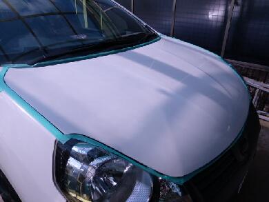 晴れている日はムラになるのでカーポートの下で施工します♪今回は時間の都合でボンネットのみ施工するので一応ほかの部分に付着しないようにマスキングをしてます^^