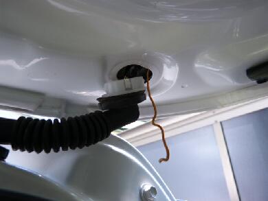 リアゲートのパネルを外し、針金を使ってリアゲート上部のブーツまで引き込みます。 |